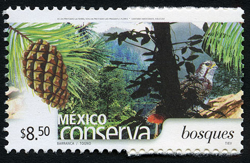 No. Scott: 2427 -- Año de Emisión: 2005 -- Valor Facial: $ 8.50 -- Multicolor -- Perforación: 13 x 13 1/4 -- Tipo de Impresión: Offset Timbre Postal multicolor perteneciente a la colección de México Conserva, al fondo de la imagen se observa un una gran extensión de terreno muy poblado de árboles, matorrales y arbustos, al frente aparece un ave parada sobre un tronco, sobre la estampilla está escrito el valor facial de "$6.50", "MÉXICO Conserva bosques" y "FERNÁNDEZ DE LA REGUERA / MITRE / TIEV". Para más información favor de dirigirse a biblioteca@mufi.org.mx