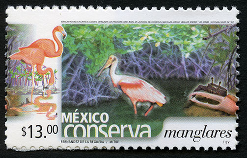No. Scott: 2432 -- Año de Emisión: 2005 -- Valor Facial: $ 13.00 -- Multicolor -- Perforación: 13 x 13 1/4 -- Tipo de Impresión: Offset Timbre Postal multicolor perteneciente a la colección de México Conserva, en el se observa un paisaje acuático, con manglares y sus peculiares raíces que se extienden por encima y debajo de los suelos espesos, enfrente aparecen algunos animales de especies terrestres y marinas, sobre la estampilla está escrito el valor facial de "$13.00", "MÉXICO Conserva manglares" y "FERNÁNDEZ DE LA REGUERA / MITRE / TIEV". Para más información favor de dirigirse a biblioteca@mufi.org.mx