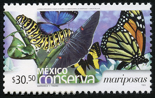 No. Scott: 2436 -- Año de Emisión: 2005 -- Valor Facial: $ 30.50 -- Multicolor -- Perforación: 13 x 13 1/4 -- Tipo de Impresión: Offset Timbre Postal multicolor perteneciente a la colección de México Conserva, en la imagen aparecen algunos insectos de gran belleza y diferentes colores, tienen antenas, ojos, patas y alas, al frente y sobre una rama en color verde se observa una oruga o larva, sobre la estampilla está escrito el valor facial de "$ 30.50", "MÉXICO mariposas" y "FERNÁNDEZ DE LA REGUERA / MITRE / TIEV". Para más información favor de dirigirse a biblioteca@mufi.org.mx