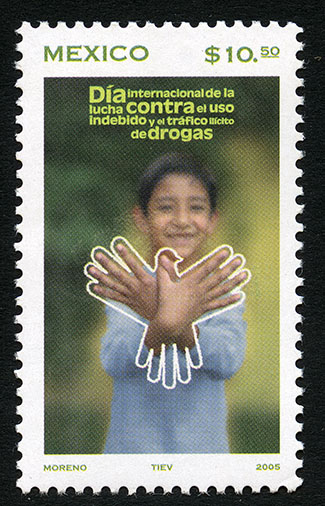 No. Scott: 2447 -- Año de Emisión: 2005 -- Valor Facial: $ 10.50 -- Multicolor -- Perforación: 13 -- Tipo de Impresión: Offset Timbre Postal Mexicano multicolor, sobre un fondo verde y amarillo, se observa a un niño vistiendo una camisa color blanco, sobresalen sus manos cruzadas y extendidas dando forma a una paloma. Sobre la estampilla está escrito "MÉXICO", el valor facial de "$10.50", "Día internacional de la lucha contra el uso indebido y el tráfico ilícito de drogas" y "MORENO, TIEV, 2005". Para más información favor de dirigirse a biblioteca@mufi.org.mx