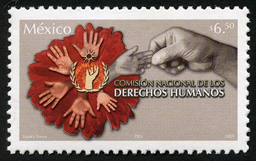 No. Scott: 2445 -- Año de Emisión: 2005 -- Valor Facial: $ 6.50 -- Multicolor -- Perforación: 13 1/4 -- Tipo de Impresión: Offset Timbre Postal Mexicano multicolor, alusivo a la Comisión Nacional de los Derechos Humanos, representado por varias manos humanitarias, en donde sobresalen dos, a mí parecer es una mano de niño y otra de adulto, las cuales se encuentran unidas entre sí, al centro se observa el emblema de esta institución, representada por una corona de olivo, al centro una mano y arriba una estrella. sobre la estampilla está escrito "México", el valor facial de "$6.50" y Nancy Torres, TIEV, 2005". Para más información favor de dirigirse a biblioteca@mufi.org.mx