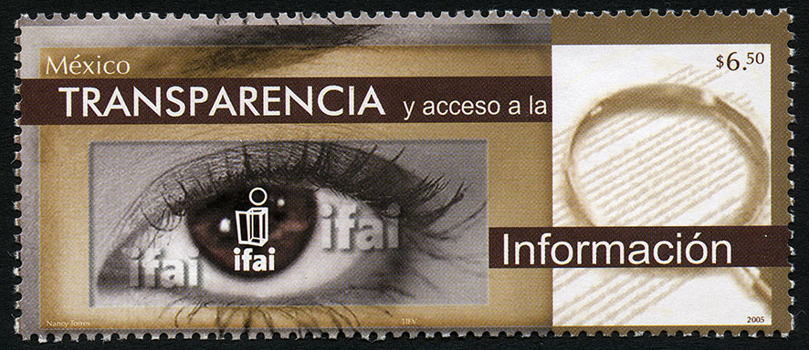 No. Scott: 2449 -- Año de Emisión: 2005 -- Valor Facial: $ 6.50 -- Multicolor -- Perforación: 13 1/4 -- Tipo de Impresión: OffsetTimbre Postal Mexicano multicolor, en la imagen y dentro de un rectángulo se observa un ojo humano y sobre de él el emblema impreso del Instituto Federal de Acceso a la Información, del lado derecho aparece un texto y un instrumento óptico en un lente de aumento sostenido por un mango. Sobre la estampilla está escrito "MÉXICO", el valor facial de "$6.50", "TRANSPARENCIA y acceso a la información" y "Nancy Torres, TIEV, 2005".