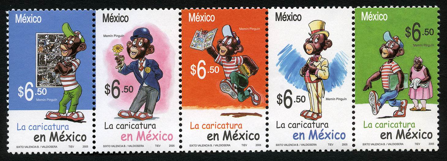 No. Scott: 2450 -- Año de Emisión: 2005 -- Valor Facial: $ 6.50 -- Multicolor -- Perforación: 13 -- Tipo de Impresión: OffsetTira de Cinco Timbres Postales multivcolor, alusivos a la Caricatura en México, en los cuales aparecen el famoso personaje Memín Pinguín, en cada estampilla se observa al personaje realizando cinco trabajos: de Historieta, de Valet, de Vendedor, de Recibidor y de Estudiante. En cada timbre está escrito "MÉXICO", el valor facial de "$6.50", "Memín Pinguin", "La Caricatura en México" y "SIXTO VALENCIA B., VALDIOSERA, TIEV, 2005".