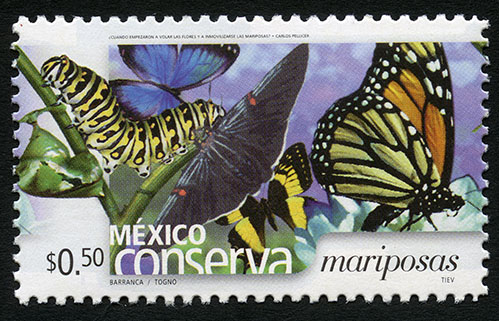 No. Scott: 2452 -- Año de Emisión: 2005 -- Valor Facial: $0.50 -- Multicolor -- Perforación: 13 x 13 1/4 y 14 -- Tipo de Impresión: Offset Timbre Postal multicolor perteneciente a la colección de México Conserva, en la imagen aparecen algunos insectos de gran belleza y diferentes colores, tienen antenas, ojos, patas y alas, al frente y sobre una rama en color verde se observa una oruga o larva, sobre la estampilla está escrito el valor facial de "$.50", "MÉXICO mariposas" y "BARRANCA / TOGNO / TIEV". Para más información favor de dirigirse a biblioteca@mufi.org.mx