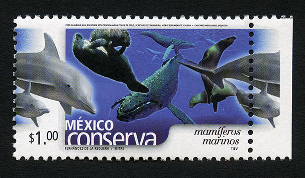 No. Scott: 2456 -- Año de Emisión: 2005 -- Valor Facial: $ 1.00 -- Multicolor -- Perforación: 13 x 13 1/4 y 14 -- Tipo de Impresión: Offset Timbre Postal multicolor perteneciente a la colección de México Conserva, en la imagen se observa un paisaje acuático en el cual aparece un gran número de mamíferos marinos, los cuales poseen poco pelo, por lo general muy pocas cerdas retenidas alrededor de la cabeza o boca, sobre la estampilla está escrito el valor facial de "$ 1.00", "MÉXICO mamíferos marinos" y "BARRANCA / TOGNO / TIEV". Para más información favor de dirigirse a biblioteca@mufi.org.mx