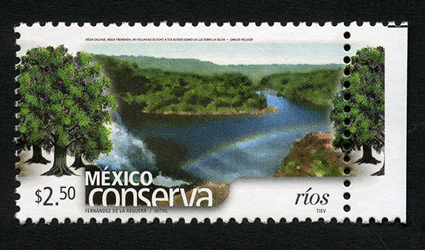 No. Scott: 2457 -- Año de Emisión: 2005 -- Valor Facial: $ 2.50 -- Multicolor -- Perforación: 13 x 13 1/4 y 14 -- Tipo de Impresión: Offset Timbre Postal multicolor perteneciente a la colección de México Conserva, al fondo de la imagen se observa un paisaje acuático rodeado de mucha vegetación, en primer plano aparecen unos árboles de tronco leñoso y copa frondosa, sobre la estampilla está escrito el valor facial de "$ 2.50", "MÉXICO Conserva ríos" y "BARRANCA / TOGNO / TIEV". Para más información favor de dirigirse a biblioteca@mufi.org.mx