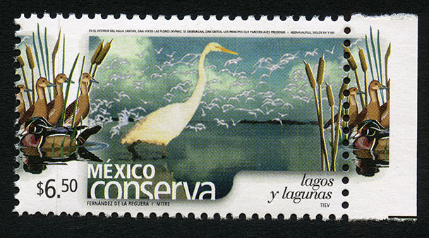 No. Scott: 2460 -- Año de Emisión: 2005 -- Valor Facial: $ 6.50 -- Multicolor -- Perforación: 13 x 13 1/4 y 14 -- Tipo de Impresión: Offset Timbre Postal multicolor perteneciente a la colección de México Conserva, al fondo de la imagen aparece una laguna de agua, sobre el cielo un gran número de aves volando, en primer plano y sobre una superficie plana se observa un ave de cuerpo color blanco, patas cortas y pico amarillo, también hay un poco de flora acuática, sobre la estampilla está escrito el valor facial de "$ 6.50", "MÉXICO lagos y lagunas" y "BARRANCA / TOGNO / TIEV". Para más información favor de dirigirse a biblioteca@mufi.org.mx