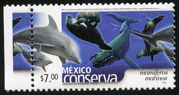 No. Scott: 2463 -- Año de Emisión: 2005 -- Valor Facial: $ 7.00 -- Multicolor -- Perforación: 13 x 13 1/4 y 14 -- Tipo de Impresión: Offset Timbre Postal multicolor perteneciente a la colección de México Conserva, en la imagen se observa un paisaje acuático en el cual aparece un gran número de mamíferos marinos, los cuales poseen poco pelo, por lo general muy pocas cerdas retenidas alrededor de la cabeza o boca, sobre la estampilla está escrito el valor facial de "$ 7.00", "MÉXICO mamíferos marinos" y "BARRANCA / TOGNO / TIEV". Para más información favor de dirigirse a biblioteca@mufi.org.mx