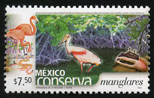 No. Scott: 2465 -- Año de Emisión: 2005 -- Valor Facial: $ 7.50 -- Multicolor -- Perforación: 13 x 13 1/4 y 14 -- Tipo de Impresión: Offset Timbre Postal multicolor perteneciente a la colección de México Conserva, en el se observa un paisaje acuático, con manglares y sus peculiares raíces que se extienden por encima y debajo de los suelos espesos, enfrente aparecen algunos animales de especies terrestres y marinas, sobre la estampilla está escrito el valor facial de "$7.50", "MÉXICO Conserva manglares" y "BARRANCA / TOGNO / TIEV". Para más información favor de dirigirse a biblioteca@mufi.org.mx