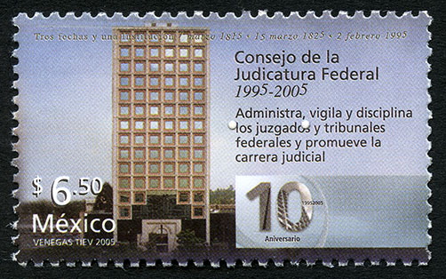 No. Scott: 2476 -- Año de Emisión: 2005 -- Valor Facial: $ 6.50 -- Multicolor -- Perforación: 13 x 13 -- Tipo de Impresión: OffsetTimbre Postal Mexicano multicolor, en la imagen se observa un edificio de gran altura y varios niveles, en cada uno se aprecian grandes ventanales, al rededor se aprecia un poco de vegetación y construcciones de menor tamaño. Sobre la estampilla está escrirto "Tres Fechas y una Institución 7 marzo 1815, 15 marzo 1825, 2 febrero de 1995" , "Consejo de la Judicatura Federal", "Administra, vigila y disciplina los juzgados y tribunales federales y promueve la carrera judicial", "$ 6.50", "MÉXICO", "10 Aniversario" y "VENEGAS, TIEV, 2005".