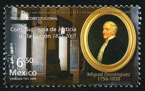No. Scott: 2477 -- Año de Emisión: 2005 -- Valor Facial: $ 6.50 -- Multicolor -- Perforación: 13 x 13 -- Tipo de Impresión: OffsetTimbre Postal Mexicano multicolor, en la imagen se observa el interior de una habitación con dos puertas de gran tamaño que abarcan parte de la estancia, del lado derecho y dentro de un óvalo en color dorado, aparece el retrato de Miguel Domínguez Alemán quien fue un político y abogado. Sobre la estampilla está escrito "Tres fechas y una Institución 7 marzo 1815, 15 marzo 1825, 2 febrero 1995", "TRIBUNAL CONSTITUCIONAL", "Corte Suprema de Justicia de la Nación 1825-2005", "$ 6.50", México", "Miguel Domínguez 1756-1830" y "VENEGAS, TIEV, 2005".