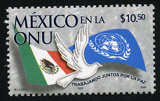 No. Scott: 2482 -- Año de Emisión: 2005 -- Valor Facial: $ 10.50 -- Multicolor -- Perforación: 13 x 1/4 -- Tipo de Impresión: Offset Timbre Postal Mexicano multicolor, sobre un fondo color gris, se observan las banderas de México y de la Organización de las Naciones Unidas, en frente de ellas aparece una paloma desplazandose en el aire. Sobre la estampilla está escrito "MÉXICO EN LA ONU", el valor facial de "$10.50", "TRABAJANDO JUNTOS POR LA PAZ" y "M.L. CORA, TIEV, 2005". Para más información favor de dirigirse a biblioteca@mufi.org.mx
