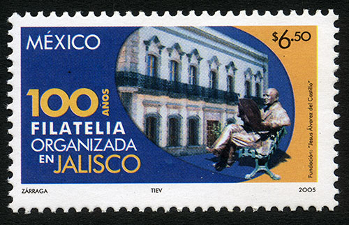 No. Scott: 2483 -- Año de Emisión: 2005 -- Valor Facial: $ 6.50 -- Multicolor -- Perforación: 13 -- Tipo de Impresión: OffsetTimbre Postal Mexicano multicolor, al fondo de la imagen y dentro de un óvalo se observa la fachada de un edificio antiguo de dos niveles, en los cuales se aprecia un gran número de ventanales y una puerta en la parte central del primer nivel, al frente aparece la estatua sentada del político mexicano Jesús Álvarez del Castillo. Sobre la estampilla está escrito "MÉXICO", el valor facial de "$6.50", "100 AÑOS DE LA FILATELIA ORGANIZADA EN JALISCO" y "ZÁRRAGA, TIEV, 2005".