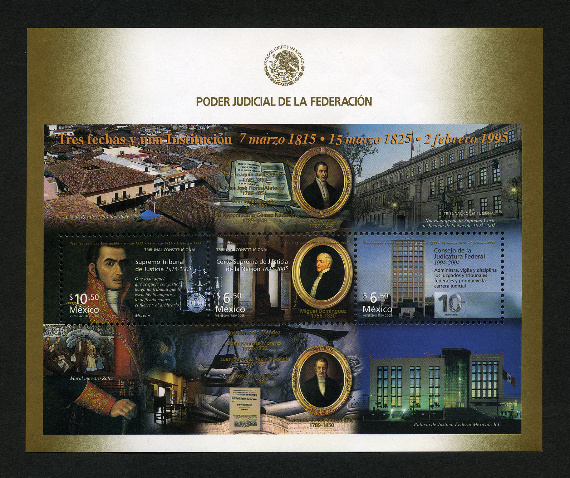 No. Scott: 2478 a -- Año de Emisión: 2005 -- Valor Facial: $ 23.50 -- Multicolor -- Perforación: 14 x 11.4 -- Tipo de Impresión: OffsetHoja Recuerdo multicolor del pais de México, alusivo al Poder Judicial de la Federación, en medio se observan tres timbres postales, en el primero aparece José María Morelos, militar insurgente de la Independencia de México, en el segundo Miguel Domínguez Alemán, abogado y político de México y en el tercero el edificio judicial, en la parte superior e inferior aparecen imágenes de personajes y edificios. Sobre la hoja está escrito "PODER JUDICIAL DELA FEDERACIÓN", "Tres fechas y una Institución 7 marzo 1815, 15 marzo 1825, 2 febrero 1995", el valor facial, "México" y "VENEGAS, TIEV, 2005".