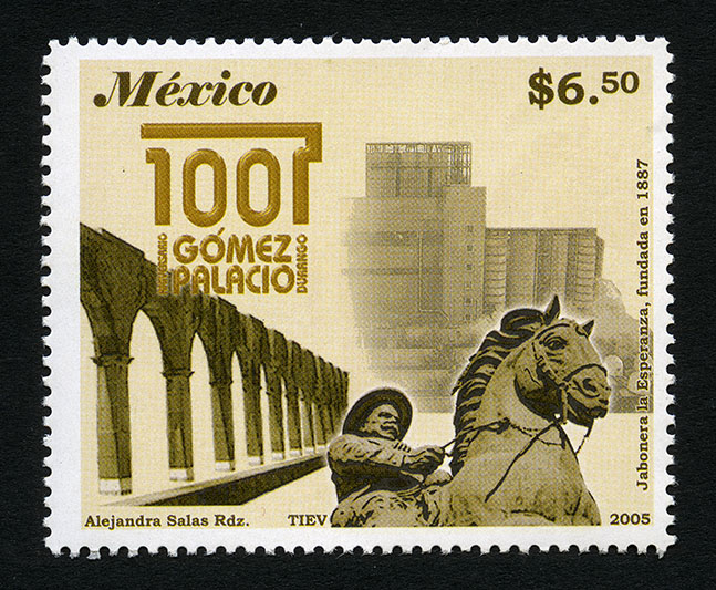 No. Scott: 2487 -- Año de Emisión: 2005 -- Valor Facial: $ 6.50 -- Multicolor -- Perforación: 13 -- Tipo de Impresión: Offset Timbre Postal Mexicano multicolor, al fondo de la imagen y en color muy tenue, se observa el antiguo edificio llamada Jabonera la Esperanza, del lado izquierdo aparece una construcción con arcos, en primer plano se aprecia un monumento del General Francisco Villa montado a caballo. Sobre la estampilla está escrito "México", valor facial de ""$6.50", "100 ANIVERSARIO Gómez Palacio DURANGO", "Jabonera La Esperanza, fundada en 1887" y "Alejandra Salas Rdz, TIEV, 2005". Para más información favor de dirigirse a biblioteca@mufi.org.mx