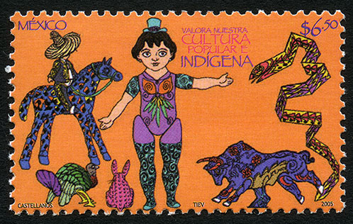 No. Scott: 2508 -- Año de Emisión: 2005 -- Valor Facial: $ 6.50 -- Multicolor -- Perforación: 13 1 /4 -- Tipo de Impresión: Offset Timbre Postal Mexicano multicolor, en la ilustracion aparecen las imágenes de un charro, una muñeca, una serpiente, un torito, un guajolote y un conejo, todos ellos decorados con muchos colores y formas. Sobre la estampilla está escrito "MÉXICO", el valor facial de "$6.50", "VALORA NUESTRA CIULTURA POPULAR E INDÍGENA" y "CASTELLANOS, TIEV, 2005". Para más información favor de dirigirse a biblioteca@mufi.org.mx