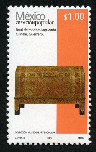 Timbre Postal Mexicano multicolor, perteneciente a la serie permanente México Creación Popular, en la imagen aparece un baúl de madera laqueada, en colores café y naranja, con decorado artístico, esta pieza fue realizada en el municipio de Olinalá, perteneciente al estado de Guerrero. Sobre la estampilla está escrito "México CREACIÓN POPULAR", el valor faciald de "$1.00", "Baúl de madera laqueada, Olinalá, Guerrero", "COLECCIÓN MUSEO DE ARTE POPULAR" y "Barranca, TIEV, 2005".