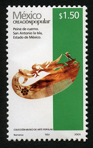 No. Scott: 2490 -- Año de Emisión: 2005 -- Valor Facial: $ 1.50 -- Multicolor -- Perforación: 13 1 /4 x 13 -- Tipo de Impresión: Offset EstucadoTimbre Postal Mexicano multicolor, perteneciente a la serie permanente México Creación Popular, en la imagen aparece un peine de cuerno en forma de pez, en la parte de arriba aparecen figuras de animales marinos y al extremo aparece la silueta de un hombre, dentro de una balsa, esta pieza fue realizada en el municipio de San Antonio la Isla, Estado de México. Sobre la estampilla está escrito "México CREACIÓN POPULAR", el valor facial de "$1.50", "Peine de cuerno. San Antonio la Isla, Estado de México", "COLECCIÓN MUSEO DE ARTE POPULAR" y "Barranca, TIEV, 2005".
