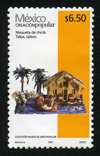 No. Scott: 2494 -- Año de Emisión: 2005 -- Valor Facial: $ 6.50 -- Multicolor -- Perforación: 13 1 /4 x 13 -- Tipo de Impresión: Offset EstucadoTimbre Postal Mexicano multicolor, perteneciente a la serie permanente México Creación Popular, en la imagen se observa una maqueta representando una casa con palmeras y personas en una balsa, mismas que aparecen remando dentro de un área de agua, esta pieza fue hecha en el municipio de Talpa, perteneciente al Estado de Jalisco. Sobre la estampilla está escrito "México CREACIÓN POPULAR", el valor facial de "$ 6.50", "Maqueta de chicle, Talpa, Jalisco", "COLECCIÓN MUSEO DE ARTE POPULAR" y "Barranca, TIEV, 2005".