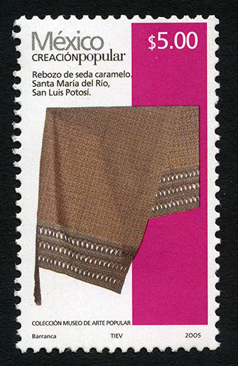 No. Scott: 2493 -- Año de Emisión: 2005 -- Valor Facial: $ 5.00 -- Multicolor -- Perforación: 13 1 /4 x 13 -- Tipo de Impresión: Offset Estucado Timbre Postal Mexicano multicolor, perteneciente a la serie permanente México Creación Popular, en la imagen se observa una prenda de vestir femenina, la cual puede ser elaborada en lana, algodón o seda. Sobre la estampilla está escrito "México CREACIÓN POPULAR", el valor facial de "$ 5.00", "Rebozo de sedea caramelo. Santa María del Río, San Luis Potosí", "COLECCIÓN MUSEO DE ARTE POPULAR" y "Barranca, TIEV, 2005". Para más información favor de dirigirse a biblioteca@mufi.org.mx