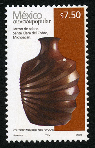 No. Scott: 2500 -- Año de Emisión: 2005 -- Valor Facial: $ 7.50 -- Multicolor -- Perforación: 13 1 /4 x 13 -- Tipo de Impresión: Offset Estucado Timbre Postal Mexicano multicolor, perteneciente a la serie permanente México Creación Popular, en la imagen se observa un recipiente en forma de vaso alto, copa o jarro grande, hecho de cobre y elaborado en el Estado de Michoacán. En la estampilla está escrito "México CREACIÓN POPULAR", el valor facial de "$ 7.50", "Jarrón de cobre. Santa Clara del Cobre, Michoacán", "COLECCIÓN MUSEO DE ARTE POPULAR" y "Barranca, TIEV, 2005". Para más información favor de dirigirse a biblioteca@mufi.org.mx