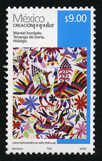 No. Scott: 2501 -- Año de Emisión: 2005 -- Valor Facial: $ 9.00 -- Multicolor -- Perforación: 13 1 /4 x 13 -- Tipo de Impresión: Offset Estucado Timbre Postal Mexicano multicolor, perteneciente a la serie permanente México Creación Popular, en la imagen se observa un mosaico multicolor, que dan forma a flores, árboles y animales, posiblemente esta pieza esté elaborada a mano. En la estampilla está escrito "México CREACIÓN POPULAR", el valor facial de "$ 9.00", "Mantel bordado. Tenango de Doria, Hidalgo", "COLECCIÓN MUSEO DE ARTE POPULAR" y "Barranca, TIEV, 2005". Para más información favor de dirigirse a biblioteca@mufi.org.mx