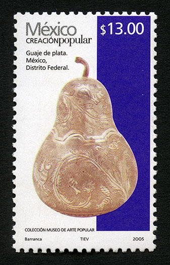 No. Scott: 2503 -- Año de Emisión: 2005 -- Valor Facial: $ 13.00 -- Multicolor -- Perforación: 13 1 /4 x 13 -- Tipo de Impresión: Offset Estucado Timbre Postal Mexicano multicolor, perteneciente a la serie permanente México Creación Popular, en la imagen se observa un guaje de plata, pieza realizada a mano por escultores que se dedican a la orfebrería y tiene detalles mexicanos. Sobre la estampilla está escrito "México CREACIÓN POPULAR", el valor facial de "$ 13.00", "Guaje de plata. México, Distrito Federal", "COLECCIÓN MUSEO DE ARTE POPULAR" y "Barranca, TIEV, 2005". Para más información favor de dirigirse a biblioteca@mufi.org.mx