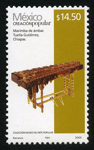 No. Scott: 2504 -- Año de Emisión: 2005 -- Valor Facial: $ 14.50 -- Multicolor -- Perforación: 13 1 /4 x 13 -- Tipo de Impresión: Offset Estucado Timbre Postal Mexicano multicolor, perteneciente a la serie permanente México Creación Popular, en la imagen se observa un instrumento de percución auditivo elaborado de ámbar y decorado artísticamente, mismo fue realizad en el estado de Chiapas. Sobre la estampilla está escrito "México CREACIÓN POPULAR", el valor facial de "$ 14.50", "Marimba de ámbar. Tuxtla Gutierrez, Chiapas", "COLECCIÓN MUSEO DE ARTE POPULAR" y "Barranca, TIEV, 2005". Para más información favor de dirigirse a biblioteca@mufi.org.mx