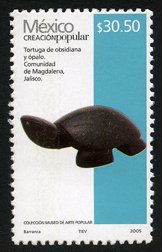 No. Scott: 2505 -- Año de Emisión: 2005 -- Valor Facial: $ 30.50 -- Multicolor -- Perforación: 13 1 /4 x 13 -- Tipo de Impresión: Offset Estucado Timbre Postal Mexicano multicolor, perteneciente a la serie permanente México Creación Popular, en la imagen se observa una tortuga de obsidiana y ópalo, realizada en la Comunidad de Magdalena, Jalisco. Sobre la estampilla está escrito "México CREACIÓN POPULAR", el valor facial de "$ 30.50", "Tortuga de obsidiana y ópalo", "COLECCIÓN MUSEO DE ARTE POPULAR" y "Barranca, TIEV, 2005". Para más información favor de dirigirse a biblioteca@mufi.org.mx