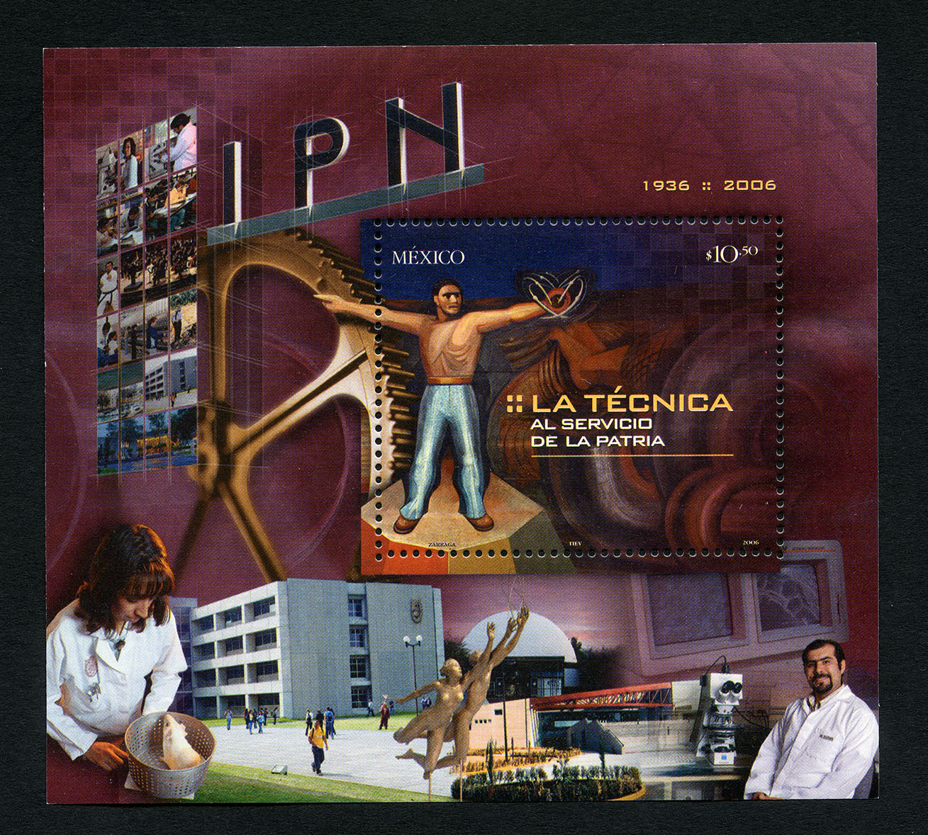 No. Scott: 2511 -- Año de Emisión: 2005 -- Valor Facial: $ 10.50 -- Multicolor -- Perforación: 13 1 /4 -- Tipo de Impresión: Offset Hoja Recuerdo multicolor Mexicano, alusiva al 70 Aniversario del Instituto Politécnico Nacional, en ella aparece un Timbre Postal de México del año 2006, con hermosas imágenes de todas las actividades referentes a la investigación, ciencia y arte realizadas en el I.P.N. Sobre la hoja y estampilla está escrito "I.P.N. 1936-2006", "MÉXICO", el valor facial de "$10.50", "LA TÉCNICA AL SERVICIO DE LA PATRIA" y "ZARRAGA, TIEV, 2006". Para más información favor de dirigirse a biblioteca@mufi.org.mx