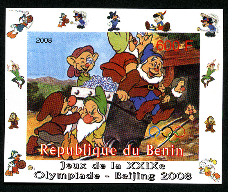Año de emisión: 2008 -- Valor Facial: 600 f -- Multicolor Hoja recuerdo imperforada del país de la República de Benin, se observa en el marco varios personajes animados de la serie de Mickey Mouse practicando el deporte de beisbol, en la parte inferior se encuentra escrito "Jeux de la XXIXe - Olympiade - Beijing 2008", en la estampilla se observa la ilustracción de siete enanos dirigiéndose a una mina, del cuento de Blanca Nieves, en la estampilla se encuentra escrito "2008", el emblema de los anillos olímpicos, el valor facial "600 F" y "Republique du Benin" Para más información favor de dirigirse a biblioteca@mufi.org.mx