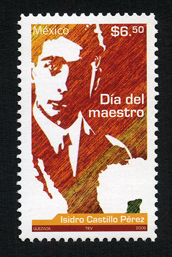 No. Scott: 2516 -- Año de Emisión: 2006 -- Valor Facial: $ 6.50 -- Multicolor -- Perforación: 13 1 /4 x 13 -- Tipo de Impresión: Offset Timbre Postal Mexicano multicolor, sobre un mosaico en colores naranja, amarillo y blanco, se observa el retrato de Isidro Castillo Pérez, quien fue educador y escritor mexicano, originario de la Piedad, Michoacán. En la estampilla está escrito "México", el valor facial de "$6.50", "Día del Maestro" y "QUEZADA, TIEV, 2006". Para más información favor de dirigirse a biblioteca@mufi.org.mx