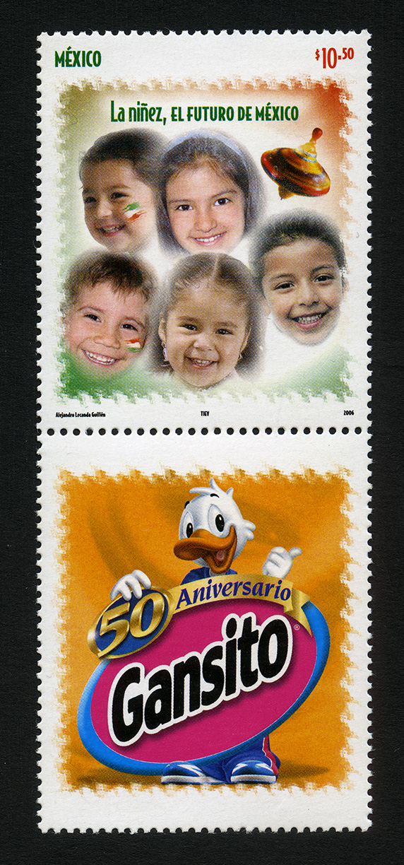 No. Scott: 2532 -- Año de Emisión: 2006 -- Valor Facial: $10.50 -- Multicolor -- Perforación: 13 1 /4 x 13 -- Tipo de Impresión: OffsetTimbre Postal mexicano y Viñeta multicolor, en la estampilla se observan las caritas sonrientes de cinco niños, dos de ellos tienen impresos en las mejillas los colores verde, blanco y rojo, en la parte superior derecha aparece un trompo, parado sobre su punta, también está escrito "MÉXICO", el valor facial de "$10.50" y "La niñez, EL FUTURO DE MÉXICO". En la viñeta anexa se observa la caricatura de un pato, sosteniendo un letrero en forma de óvalo, en el cual dice "50 ANIVERSARIO Gansito".