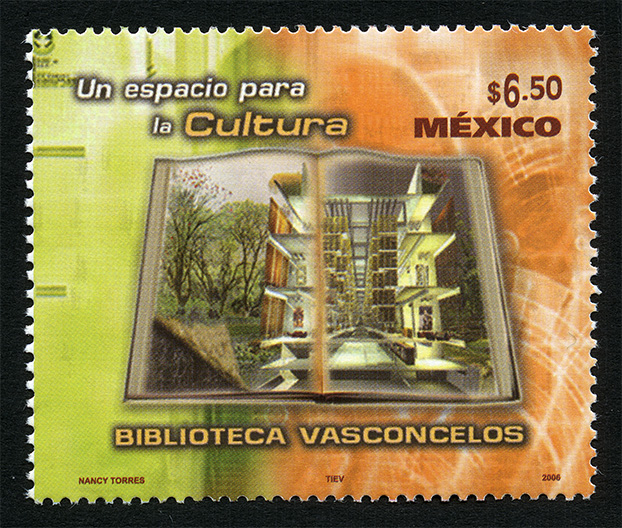 No. Scott: 2517 -- Año de Emisión: 2006 -- Valor Facial: $6.50 -- Multicolor -- Perforación: 13 1/4 x 13 -- Tipo de Impresión: Offset Para más información favor de dirigirse a biblioteca@mufi.org.mx Timbre Postal Mexicano multicolor, al fondo de la imagen se observa un mosaico en colores verde y naranja, adornado con líneas curvas y rectas, en medio aparece la forma de un libro abierto y dentro de él, se aprecia un área boscosa y parte del interior de una biblioteca. Sobre la estampilla está escrito "Un espacio para la Cultura", el valor facial de "$6.50", "MÉXICO", "BIBLIOTECA VASCONCELOS" y "NANCY TORRES, TIEV, 2006".