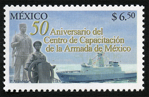 No. Scott: 2521 -- Año de Emisión: 2006 -- Valor Facial: $6.50 -- Multicolor -- Perforación: 13 -- Tipo de Impresión: Offset Timbre Postal Mexicano multicolor, al fondo de la imagen se observa un cielo azul, en medio hay una gran extensión de agua y sobre de ésta, una embarcación de enorme tamaño, en primer plano, aparecen dos hombres cada uno sostiene un timón de barco. Sobre la estampilla está escrito "MÉXICO", el valor facial de "$6.50", "50 Aniversario del Centro de Capacitación de la Armada de México" y "P. Arámbula, TIEV, 2006". Para más información favor de dirigirse a biblioteca@mufi.org.mx