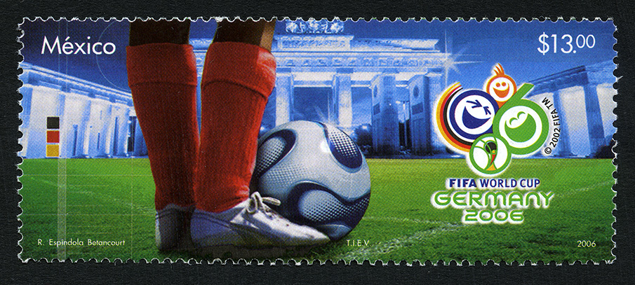 No. Scott: 2519 -- Año de Emisión: 2006 -- Valor Facial: $13.00 -- Multicolor -- Perforación: 13 1/4 x 13 -- Tipo de Impresión: OffsetTimbre Postal Mexicano multicolor, al fondo de la imagen y sobre un anochecer, se observa la puerta de Brandemburgo, antigua entrada a Berlín, al frente hay un campo deportivo empastado y sobre de él, se aprecian un par de piernas humanas portando calcetas en color rojo y tenis deportivos, en frente aparece un balón de futbol, del lado derecho está impreso el logotipo de "FIFA WORLD CUP GERMANY 2006". Sobre la estampilla está escrito "México", el valor facial de "$13.00" y "R. Espíndola Betancourt, TIEV, 2006".