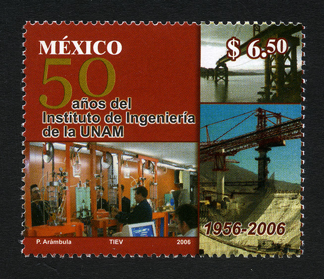 No. Scott: 2525 -- Año de Emisión: 2006 -- Valor Facial: $ 6.50 -- Multicolor -- Perforación: 13 1/4 x 13 -- Tipo de Impresión: Offset Timbre Postal Mexicano multicolor, del lado izquierdo de la imagen aparece un grupo de jóvenes realizando actividades dentro de un laboratorio, del lado derecho se observan dos puentes colgantes, uno sobre hecho sobre una gran cantidad de agua y el otro sobre una estructura metálica. Sobre la estampilla está escrito "MÉXICO", "50 años del Instituto de Ingeniería de la UNAM", "1956-2006" y "P. Arámbula, TIEV, 2006". Para más información favor de dirigirse a biblioteca@mufi.org.mx