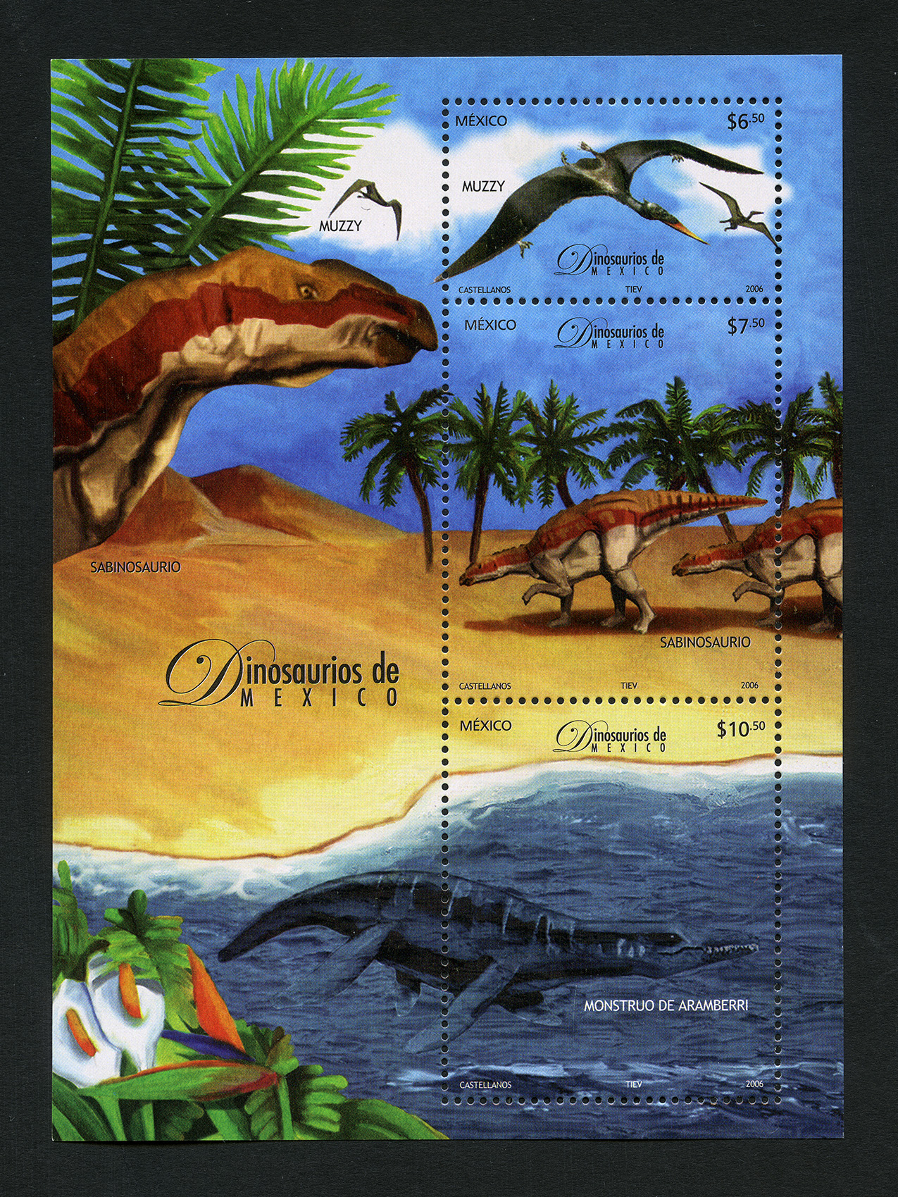 No. Scott: 2524 -- Año de Emisión: 2006 -- Valor Facial: $ 24.50 -- Multicolor -- Perforación: 13 1/4 -- Tipo de Impresión: OffsetHoja Recuerdo con tres Timbres Postales multicolores, alusiva a los Dinosaurios de México, en la parte superior aparece un cielo azul, en medio un paisaje árido con muy poca vegetación, al interior una vista acuática, en la primera estampilla aparece un Muzzi, reptíl volador, en la segunda un Sabinosaurio de gran tamaño y cabeza plana y en la tercera se observa al Mostruo de Aramberri, enorme reptir volador. Sobre la hoja aparece escrito "MÉXICO", el valor facial, "Dinosaurios de MÉXICO" y "CASTELLANOS, TIEV, 2006".