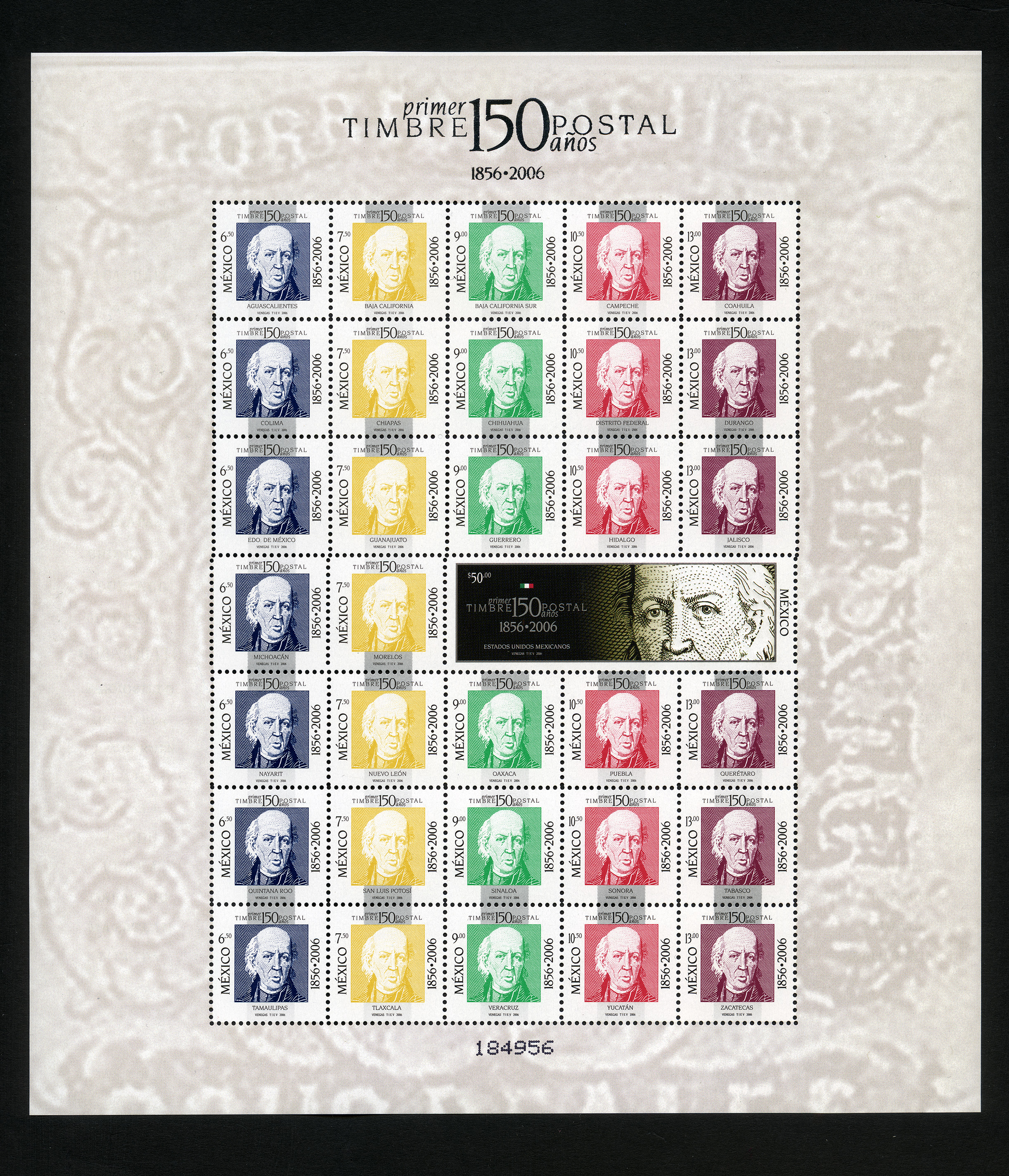 No. Scott: 2526 -- Año de Emisión: 2006 -- Valor Facial: $ 343.00 -- Multicolor -- Perforación: 13 1/4 x 13 -- Tipo de Impresión: Offset Hoja completa con treinta y tres Timbres Postales multicolor de México, en cada estampilla aparece el retrato de busto de Miguel Hidalgo y Costilla, militar insurgente y sacerdote novohispano de México. En cada timbre está escrito el valor facial, "Primer TIMBRE POSTAL 150 años 1856-2006", "ESTADOS UNIDOS MEXICANOS", el nombre de cada uno de los Estados de México y "VENEGAS, TIEV, 2006". Para más información favor de dirigirse a biblioteca@mufi.org.mx