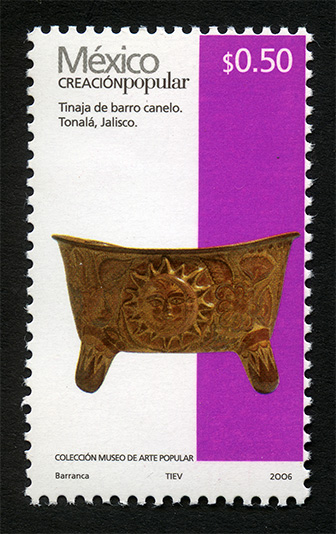 No. Scott: 2488a -- Año de Emisión: 2006 -- Valor Facial: $ .50 -- Multicolor -- Perforación: 13 1 /4 x 13 -- Tipo de Impresión: Offset Estucado Timbre Postal Mexicano multicolor, perteneciente a la serie permanente México Creación Popular, en la imagen aparece una tinaja de barro en color café, decorado artísticamente, apareciendo un sol en la parte central, esta pieza fue elaborada en el Municipio de Tonalá, del Estado de Jalisco. Sobre la estampilla está escrito "México CREACIÓN POPULAR", el valor facial de "$.50", "Tinaja de barro canelo, Tonalá Jalisco", "COLECCIÓN MUSEO DE ARTE POPULAR" y "Barranca, TIEV, 2006". Para más información favor de dirigirse a biblioteca@mufi.org.mx