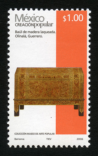 Timbre Postal Mexicano multicolor, perteneciente a la serie permanente México Creación Popular, en la imagen aparece un baúl de madera laqueada, en colores café y naranja, con decorado artístico, esta pieza fue realizada en el municipio de Olinalá, perteneciente al estado de Guerrero. Sobre la estampilla está escrito "México CREACIÓN POPULAR", el valor faciald de "$1.00", "Baúl de madera laqueada, Olinalá, Guerrero", "COLECCIÓN MUSEO DE ARTE POPULAR" y "Barranca, TIEV, 2006".