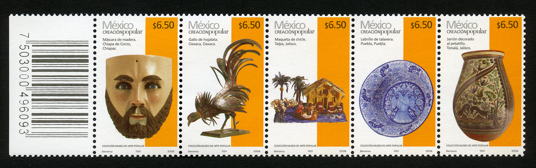 No. Scott: 2498a -- Año de Emisión: 2006 -- Valor Facial: $ 32.50 -- Multicolor -- Perforación: 13 1 /4 x 13 -- Tipo de Impresión: Offset EstucadoSerie de cinco Timbres Postales multicolor, pertenecientes a la colección permanente México Creación Popular, en la primera estampilla se observa una máscara de madera, originaria de Chiapa de Corzo, en la segunda aparece un gallo de hojalata, perteneciente al estado de Oaxaca, en la tercera hay una maqueta de chicle drealizada en Talpan, Jalisco, en la cuarta se aprecia un lebrillo de talavera, procedente de Puebla y en la quinta aparece un jarrón decorado al petatillo de Tonalá Jalisco. En cada timbre está escrito "México CREACIÓN popular", el valor facial de "$6.50", el nombre y origen de cada pieza, "COLECCIÓN MUSEO ARTE POLPULAR" Y "Barranca, TIEV, 2006".