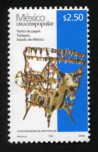 No. Scott: 2492a -- Año de Emisión: 2006 -- Valor Facial: $ 2.50 -- Multicolor -- Perforación: 13 1 /4 x 13 -- Tipo de Impresión: Offset Estucado Timbre Postal Mexicano multicolor, perteneciente a la serie permanente México Creación Popular, en la imagen se observa la figura de un torito hecho de papel, al rededor está adornado con una gran cantidad de papelitos multicolor que unidos entre sí, forman diversas figuras geométricas. Sobre la estampilla está escrito "México CREACIÓN POPULAR", el valor facial de "$ 2.50", "Torito de papel. Tultepec, Estado de México", "COLECCIÓN MUSEO DE ARTE POPULAR" y "Barranca, TIEV, 2006". Para más información favor de dirigirse a biblioteca@mufi.org.mx
