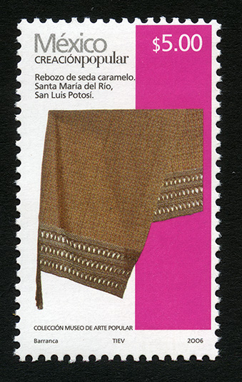No. Scott: 2493a -- Año de Emisión: 2006 -- Valor Facial: $ 5.00 -- Multicolor -- Perforación: 13 1 /4 x 13 -- Tipo de Impresión: Offset Estucado Timbre Postal Mexicano multicolor, perteneciente a la serie permanente México Creación Popular, en la imagen se observa una prenda de vestir femenina, la cual puede ser elaborada en lana, algodón o seda. Sobre la estampilla está escrito "México CREACIÓN POPULAR", el valor facial de "$ 5.00", "Rebozo de sedea caramelo. Santa María del Río, San Luis Potosí", "COLECCIÓN MUSEO DE ARTE POPULAR" y "Barranca, TIEV, 2006". Para más información favor de dirigirse a biblioteca@mufi.org.mx