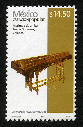 No. Scott: 2504a -- Año de Emisión: 2006 -- Valor Facial: $ 14.50 -- Multicolor -- Perforación: 13 1 /4 x 13 -- Tipo de Impresión: Offset Estucado Timbre Postal Mexicano multicolor, perteneciente a la serie permanente México Creación Popular, en la imagen se observa un instrumento de percusión auditivo elaborado de ámbar y decorado artísticamente, mismo fue realizad en el estado de Chiapas. Sobre la estampilla está escrito "México CREACIÓN POPULAR", el valor facial de "$ 14.50", "Marimba de ámbar. Tuxtla Gutiérrez, Chiapas", "COLECCIÓN MUSEO DE ARTE POPULAR" y "Barranca, TIEV, 2006". Para más información favor de dirigirse a biblioteca@mufi.org.mx