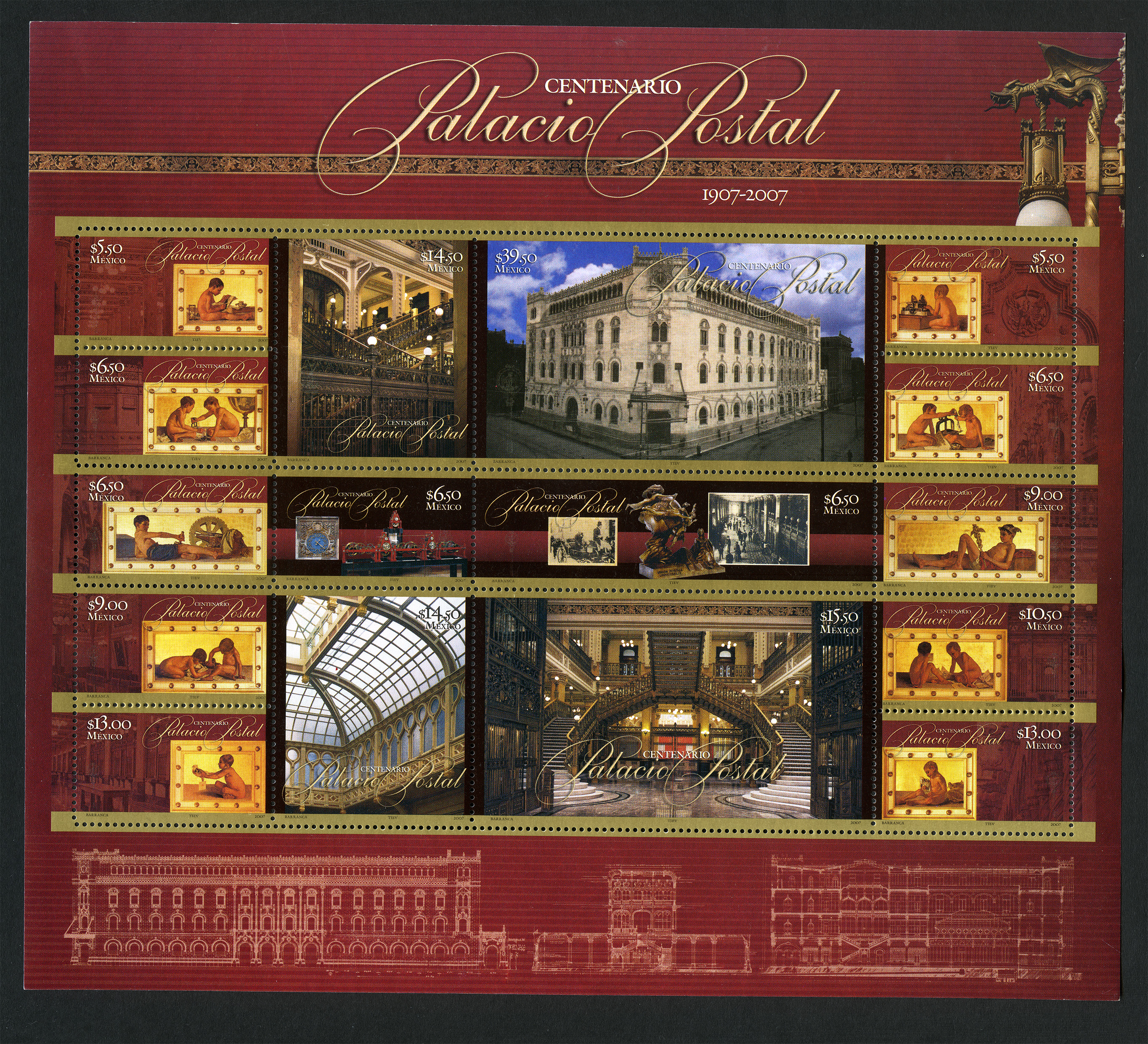 No. Scott: 2545 -- Año de Emisión: 2007 -- Valor Facial: $ 182.00 -- Multicolor -- Perforación: 13 x 14 1/4 -- Tipo de Impresión: OffsetHoja Recuerdo con dieciseis Timbres Postales multicolor, alusiva al Centenario del Palacio Postal, en las estampillas del los lados izquierdo y derecho aparecen imágenes de niños semidesnudos realizando diferentes actividades, en la parte central se observa la fachada del edificio del Palacio Postal y los interiores del mismo. Sobre la hoja y dentro de los timbres está escrito "CENTENARIO PALACIO POSTAL 1907-2007", el valor facial y "BARRANCA, TIEV, 2007".
