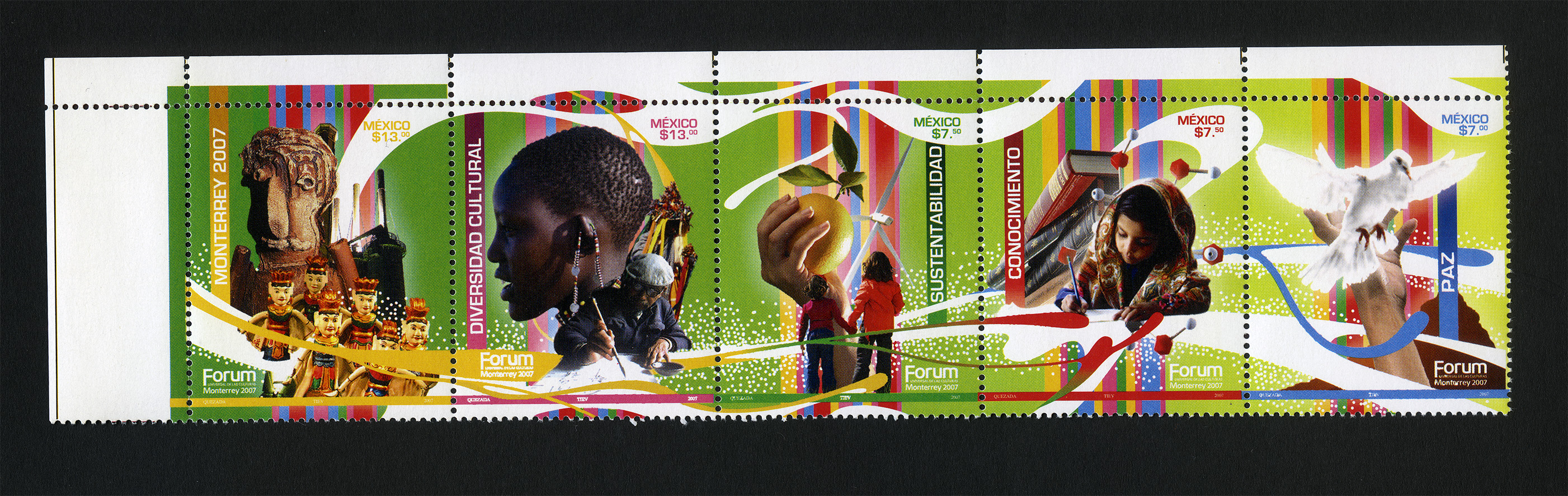 No. Scott: 2547 -- Año de Emisión: 2007 -- Valor Facial: $ 48.00 -- Multicolor -- Perforación: 13 x 13 1/4 -- Tipo de Impresión: OffsetTira de 5 Timbres Postales de México, alusivos al Fórum Universal de las Culturas Monterrey 2007, en cada estampilla aparecen imágenes que representan diferentes temas, la primera representa a Monterrey 2007, la segunda a la Diversidad Cultural, la tercera a la Sustentabilidad, la cuarta al Conocimiento y la quinta a la Paz. En cada timbre está escrito "MÉXICO", el valor facial, el tema que representa cada imagen, "Forum Monterrey 2007" y "QUEZADA, TIEV, 2007".