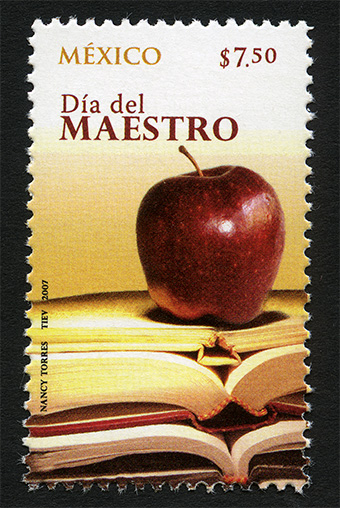 No. Scott: 2539 -- Año de Emisión: 2007 -- Valor Facial: $ 7.50 -- Multicolor -- Perforación:13 1/4 x 13 -- Tipo de Impresión: Offset Timbre Postal Mexicano multicolor, en la imagen se observan tres libros abiertos y sobre de ellos aparece una fruta comestible color rojo en forma de globo y un poco hundida en sus extremos. En la estampilla está escrito "MÉXICO", el valor facial de "$7.50", "Día del MAESTRO" y "NANCY TORRES, TIEV, 2007". Para más información favor de dirigirse a biblioteca@mufi.org.mx