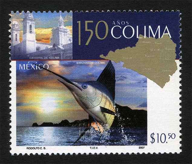 No. Scott: 2544 -- Año de Emisión: 2006 -- Valor Facial: $ 10.50 -- Multicolor -- Perforación:13 1/4 x 13 -- Tipo de Impresión: OffsetTimbre Postal Mexicano multicolor, alusivo a los 150 años de la Fundación del Estado de Colima, en la parte superior y del lado izquierdo,se observa parte de la fachada de la catedral de Colima, en la parte inferior y al fondo se aprecia un atardecer en el mar con algunas montañas, sobre una gran extensión de agua, aparece la imagen de un Pez Vela, cuyo cuerpo es hidrodinámico y musculoso, con hocico estrecho hasta terminar en una punta muy afilada, también aparece impreso el mapa de la Ciudad de Colima. Sobre la estampilla está escrito "150 AÑOS COLIMA", "MÉXICO", el valor facial de "$10.50" y "RODOLFO E.B., TIEV, 2007".