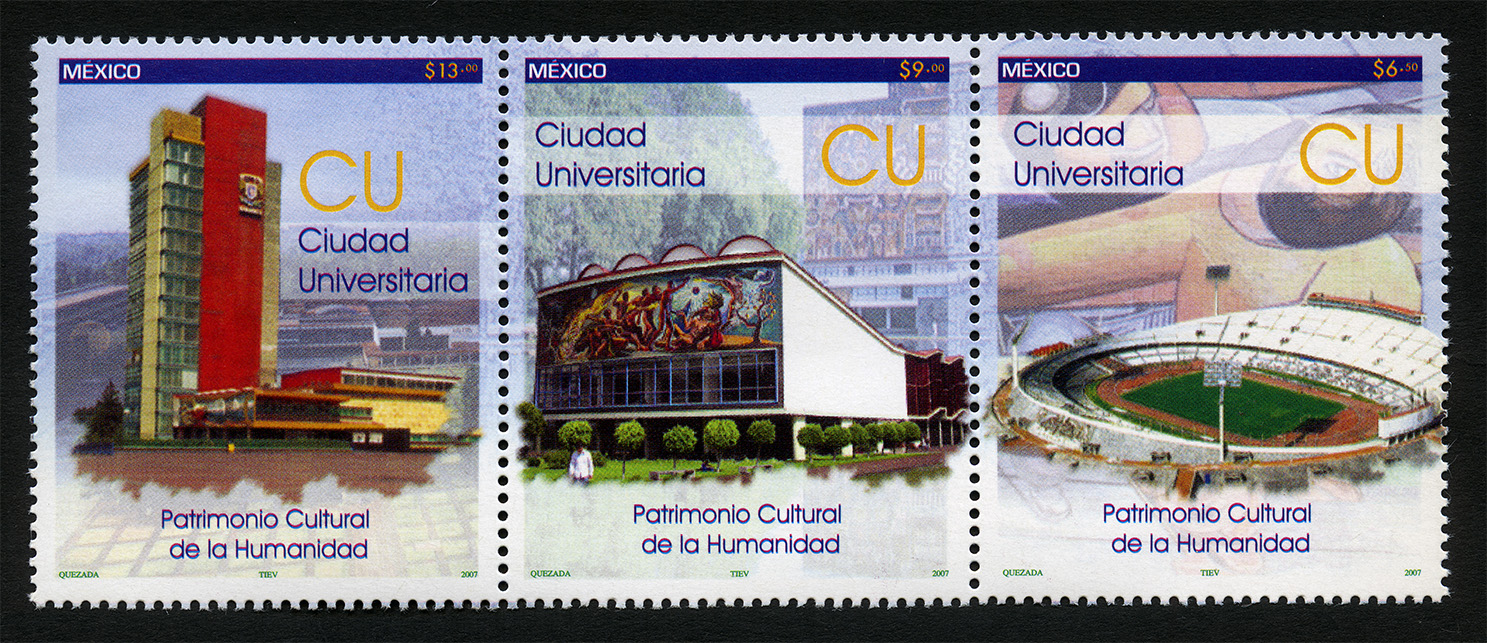 No. Scott: 2548 -- Año de Emisión: 2007 -- Valor Facial: $ 28.50 -- Multicolor -- Perforación:13 x 13 1/4 -- Tipo de Impresión: Offset Tira de tres Timbres Postales multicolor de México, alusivos a La Ciudad Universitaria, en la primera imagen se observa el edificio de Rectoría, en medio aparece la Biblioteca y al final está el Estadio Olímpico Universitario. En cada estampilla está escrito "MÉXICO", el valor facial, "Ciudad Universitaria CU, "Patrimonio Cultural de la Humanidad" y "QUEZADA, TIEV, 2007". Para más información favor de dirigirse a biblioteca@mufi.org.mx